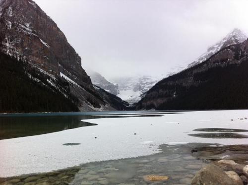 雪中的落基山有一种难以形容的美,远方云雾旋绕的群山,披上银霜的苍松翠柏,还有明澈的湖水,似乎置身于仙界。耳畔的落雪悄悄的飘洒在湖面、脚下、树梢,宣布沙沙的轻语。北国的风光,正是如此,大气、沉重,又带有一种安静的空寂。